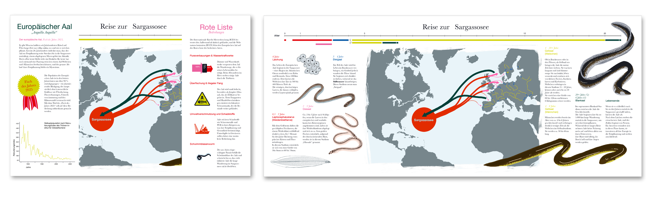 Auf einer Doppelseite mit Klappseiten habe ich den Lebensweg des europäischen Aales dargestellt. Zusätzlich zu dem Zeitstrahl ist noch eine Karte entstanden, sowie Illustrationen des Aales in verschiedenen Stadien.